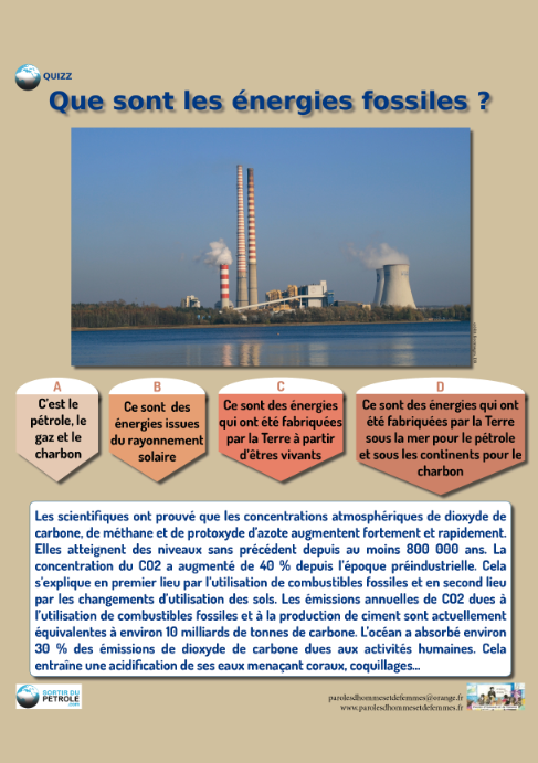 Toutes les réponses sont justes. Le pétrole, le charbon et le gaz sont des énergies issues d’une vie lointaine, végétale et animale, elle-même irriguée par l’énergie solaire. Le pétrole s’est ainsi formé à partir d’une ancienne vie marine tandis que le charbon provient d’une ancienne vie terrestre. Principalement composé de méthane, le gaz est lui issu d’émissions consécutives à ces transformations de la matière entre la vie et l’énergie fossile -des émissions restées prisonnières dans des poches souterraines imperméables.