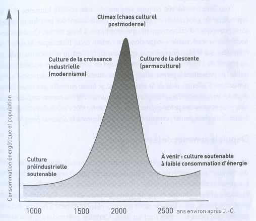 Ainsi, quand David Holmgren schématise le pic pétrolier ou pic des énergies fossiles, le "modernisme" y représente la partie ascendante, c’est-à-dire la “culture de la croissance industrielle” tandis que la permaculture représente la “culture de la descente”.