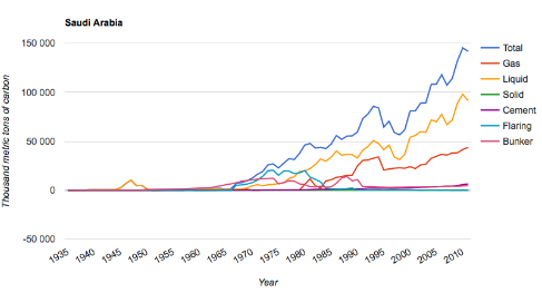 Rappelons que les travaux du Groupe d’experts intergouvernemental sur l’évolution du climat (GIEC) montrent qu’il faut émettre au niveau mondial moins de 1000 milliards de tonnes de CO2 après 2010 si l’on veut conserver deux chances sur trois de rester sous la limite d’un réchauffement de +2°C depuis l’époque préindustrielle. Ce « budget carbone » impose selon les scientifiques qu’on laisse sous terre 80 % de la réserve prouvée 2011 de charbon, de gaz et de pétrole. Le pétrole de l'Arabie Saoudite est l'un des moins chers à extraire et les réserves prouvées de ce pays sont estimées à environ 36 milliards de tonnes de brut soit des émissions de plus de 110 milliards de tonnes de CO2.