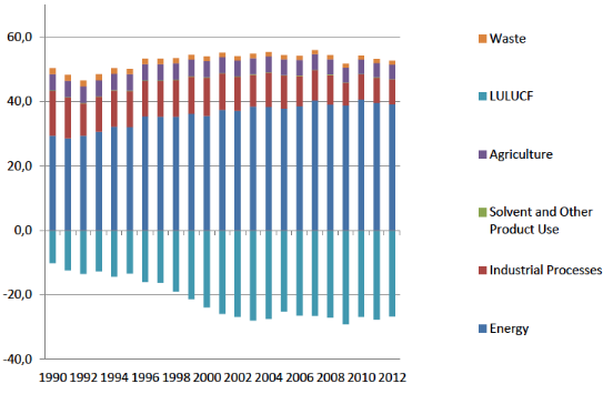 Cependant, les émissions norvégiennes sans l’usage des terres et les forêts (environ 50 millions de tonnes équivalent CO2) n’ont pas baissé depuis 1990, augmentant même légèrement de 5% entre 1990 et 2012. Seule l’activité forestière améliore cette comptabilité carbone.