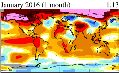 Depuis 4 mois, toutes les anomalies de température mesurées au Goddard Institute dépassent +1°C tandis que les données de janvier du centre NOAA (National Oceanic and Atmospheric Administration) doivent être publiées dans les prochains jours. Cette situation est bien sûr attribuée à El NIno qui actuellement est à son stade extrême et booste également la concentration de CO2 dans l’atmosphère, en affaiblissant dans les zones tropicales le rôle de pompe à dioxyde de carbone des végétaux. Il est à ce jour envisagé que cette influence s’efface vers le milieu 2016.