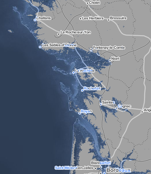 De plus, cette montée des eaux ne pourrait donc plus être arrêtée. A terme, avec + 10 à 20 m, il n’y aurait plus de ville d’Arles. C’est Avignon qui serait en bord de mer, tout comme Niort sur la côte Atlantique... Englouties les îles d’Oléron, de Ré, de Noirmoutier... Englouties également les villes de La Rochelle, Rochefort-sur-Mer, Fréjus, Saint-Tropez, Sainte-Maxime, La Grande Motte, Agde, Port-la-Nouvelle, Arcachon, les Sables d’Olonne, Challans, Machecoul, Saint-Nazaire, Séné, Lorient, Concarneau, Deauville, Dieppe, Le Crotoy... Cette liste n’étant pas exhaustive. Royan essaierait de survivre sur une île, le département de la Manche deviendrait également une île, la Gironde prendrait Bordeaux, La Loire prendrait Nantes, la méditerranée prendrait Toulon, l’Océan Atlantique prendrait le Golfe du Morbihan en laissant Sarzeau sur un morceau de terre... Et puis encore, en Loire-Atlantique, Pontchâteau ferait face à l’île de Guérande-Pornichet et dans les Charentes l’eau salée irait jusqu’à Saintes, Cognac...