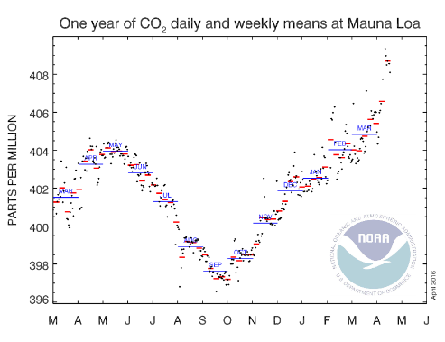 Il est néanmoins très provisoire car le pic de concentration annuel du CO2 est traditionnellement relevé en avril – mai, pendant le printemps de l’hémisphère nord, c’est-à-dire avant que la végétation de cette partie du globe n’exerce son rôle de pompe à carbone. Ce record va même selon toute vraisemblance faire un nouveau bond en avril, mois durant lequel l’observatoire de Mauna Loa a déjà enregistré des records de moyennes journalières grimpant jusqu’à 409,44 ppm le 9 avril ainsi que des records de moyennes hebdomadaires atteignant jusqu’à 408,69 ppm pour la semaine commençant le 10 avril (+4,59 ppm par rapport à 2015). La barre des 410 ppm en moyenne journalière peut donc être dépassée dès cette année.