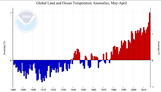 Toujours selon NOAA, Les douze derniers mois (mai 2015 – avril 2016) ont été en moyenne plus chaud de 1,00°C que la moyenne du XXème siècle. Précision: l’objectif universel de + 1,5°C - +2°C en tant que limite relative à ne pas dépasser pour rester dans un monde vivable est à considérer à partir de l’époque préindustrielle, c’est-à-dire avant le XXème siècle. Si l’on prend maintenant les statistiques du Goddard Institute For Space Studies (GISS) de la NASA, qui confirment la tendance, alors on arrive selon le scientifique américain James Hansen, à + 1,25°C par rapport à la période 1880-1920.