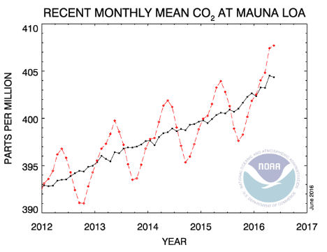 La concentration moyenne de CO2 a atteint 407,70 parties par million (ppm) en mai à l'Observatoire Mauna Loa, à HawaÏ, une station faisant référence en la matière. Avec 3,76 ppm de plus que le précédent record, établi en mai 2015, cette concentration marque également une accélération record. L'augmentation était globalement de plus ou moins 2 ppm chaque année au début du XXIème siècle, puis elle a dépassé tous les ans + 2ppm à partir de 2011. Là, elle approche donc 4 ppm. Un pic d'accélération à +2,93 ppm avait également été noté en 1998 à l'époque du dernier phénomène El Nino de puissance comparable à celui qu'on a vient de connaître et qui se termine.