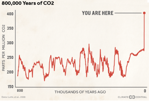 Ayant dépassé pour la première fois à Mauna Loa la barre de 400 ppm en moyenne journalière le 9 mai 2013, la concentration atmosphérique de CO2 a ensuite poursuivi son évolution selon la forme d'une sinusoïde, avec des minimums au début de l'automne (consécutifs à la phase de végétation sur les terres de l'hémisphère nord, les plus nombreuses) et des maximums au printemps (consécutifs à l'arrêt de la phase de végétation dans l'hémisphère nord), jusqu'à 409,44 ppm en moyenne journalière le 9 avril dernier et 407,7 ppm en moyenne mensuelle en mai.