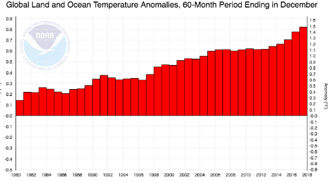 Difficilement attribuable au seul phénomène El Nino extrême 2015-2016 (de toute façon, ce type d'El Nino est appelé à être plus fréquent avec le réchauffement planétaire anthropique), l'accélération de ces dernières années est bien mise en évidence quand on lisse sur cinq ans la température moyenne à la surface du globe. Après une sorte de plateau entre 2005 et 2011, cette moyenne n'a depuis pas cessé d'augmenter, selon les données de NOAA. Elle est passée d'environ +0,6°C chacune de ces années-là, à +0,82°C en 2017 (contre +0,78°C enregistré en 2016). Cette tendance se poursuivra encore cette année si 2018 est plus chaude que 2013, durant laquelle NOAA avait enregistré une anomalie de +0,67°C par rapport à la moyenne du siècle dernier. Dès lors, l'actuelle poussée du réchauffement planétaire apparaît bien plus puissante que celles enregistrées à la fin des décennies 1980 et 1990...