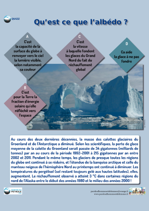 Il y a une seule réponse fausse: la réponse  C. L’albédo est le pouvoir réfléchissant d’une surface. Ainsi, la couleur blanche réfléchit plus le rayonnement lumineux que les couleurs sombres. Dans le premier cas la lumière repart davantage vers l’espace (l’albédo est important) tandis que dans le second elle va être davantage captée (l’albédo est faible). Faites l’expérience: touchez une voiture blanche puis une voiture noire en plein soleil. La plus chaude sera la noire. Ce phénomène a une conséquence en ce qui concerne la fonte des glaces enclenchée par le phénomène du réchauffement global, notamment dans l’Arctique. En effet, selon le principe de l’albédo, plus la glace va fondre, moins elle renverra le rayonnement lumineux vers l’espace et plus elle laissera de place à la mer, sombre. Et plus cette mer sombre captera la chaleur, plus la fonte de la glace s’accélèrera en retour. C’est ce que l’on peut appeler un cercle vicieux.