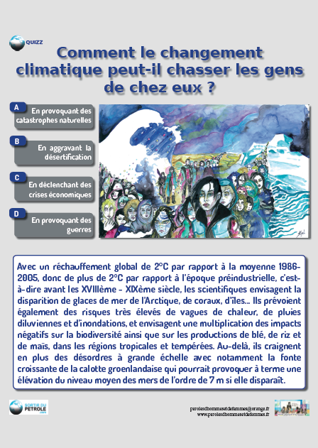 Toutes les réponses sont vraies. Le changement climatique n’a pas que des effets environnementaux comme le renforcement de phénomènes extrêmes, le renforcement des pluies et de la sécheresse selon les endroits, le renforcement de la désertification... La réduction des terres cultivables, l’avancée du désert, la multiplication des mauvaises récoltes, les destructions diverses répétées, sont de nature à provoquer des crises économiques, à aggraver la pauvreté, à exacerber les rivalités, à provoquer des guerres civiles et des guerres entre pays, à alimenter le terrorisme... Ainsi, la situation actuelle de la Syrie n’est pas sans lien avec les sécheresses successives qu’a connu ce pays.