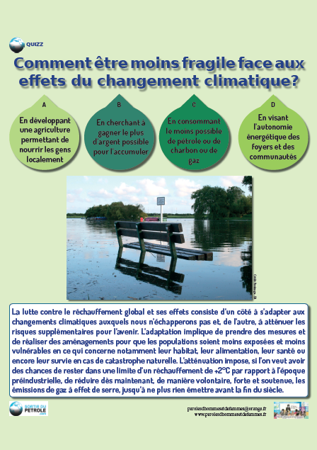 Notre société mondialisée ne pourrait pas exister sans la débauche d’énergie fossile, donc de gaz à effet de serre, qu’elle nécessite pour transporter tous les produits échangés à travers la planète. Lutter contre les effets du changement climatique, c’est notamment réduire ses émissions de gaz à effet de serre. Cela nous impose à la fois une sortie des énergies fossiles et une relocalisation de nos activités. Consommer moins de pétrole, de charbon et de gaz, nourrir les gens à partir d’une agriculture locale et assurer une autonomie locale en énergie aux populations, sont ainsi trois moyens de renforcer sa résilience, d’être moins fragile face aux effets du changement climatique. Les réponses A, C et D sont donc vraies. En revanche, l’accumulation d’argent comme l’accumulation de biens ne sera pas à terme d’un grand secours. La réponse B est fausse.