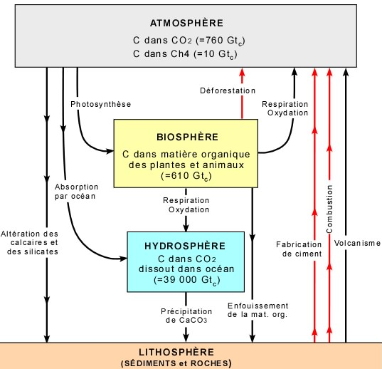 A l’état de CO2, le carbone réside en moyenne dans l’atmosphère entre 50 et 200 ans selon les conditions du moment. L’Institut français du pétrole donne une moyenne de 125 ans. Pour nous, c’est long, mais à l’échelle des temps géologiques, c’est très court. Par exemple, il faut environ 200 millions d’années pour passer du stade de carbone-vivant au stade de carbone-pétrole par la fossilisation. Si bien qu’on peut schématiquement distinguer, à l’instar de feu Pierre-André Bourque, professeur émérite de géologie de l’Université Laval de Québec, un cycle court du carbone (au niveau de l’atmosphère, de la surface terrestre, des êtres vivants), et un cycle long du carbone (fonds des océans, roches sédimentaires, mouvements tectoniques…).