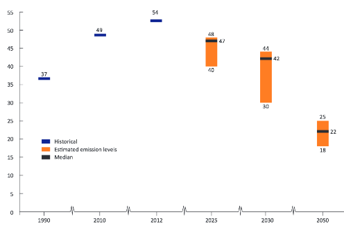 - Réduire de moitié des émissions totales de gaz à effet de serre (CO2 , méthane, protoxyde d’azote, halocarbures) d'ici 2050. “Depuis 1990, les émissions mondiales de gaz à effet de serre ont augmenté de plus de 45 %. Pour espérer rester en dessous du seuil des 2 °C, ces émissions doivent diminuer d'environ 15 % d'ici à 2030 par rapport au niveau de 2010 et d'au moins 50 % d'ici à 2050 pour atteindre l'objectif de zéro émission nette de GES”, souligne le PNUE.