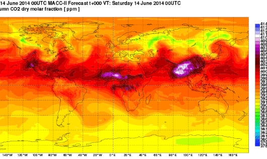 La carte de MACC représentant la concentration de CO2 le 14 juin dernier montre, comme toutes celle de ce mois-là, une concentration de CO2 plus forte de quelques “parties par million” (ppm) dans l’espace allant de l’équateur vers les zones tempérées, et plus particulièrement dans l’Hémisphère Nord. On note également des pics à 410 ppm voire plus. Les zones qui vont des zones tempérées vers les pôles ont en revanche des concentrations qui peuvent aller jusqu’à 390 ppm, notamment vers le Pôle Sud, la Sibérie et également le Canada.