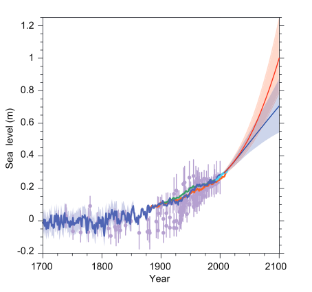Cependant, redémarrage comme par hasard à la fin du XIXème siècle. Cette nouvelle hausse, « clairement détectée dans les observations instrumentales les plus anciennes des marégraphes » -et coïncidant avec ce qu’il est maintenant convenu d’appeler l’anthropocène- donne un taux moyen d’élévation de 1,7 mm/an sur la période 1901-2010. Ce taux double quasiment entre 1993 et 2014 avec 3,2 mm/an. Ce qui donne une vingtaine de centimètres en plus depuis la fin du XIXème siècle et une hausse possible de l’ordre du mètre à l’horizon 2100 si l’on poursuit sur notre lancée actuelle sans sortir des énergies fossiles (jusqu’à plus de 80 centimètres en 2081-2100 par rapport à 1986-2005). Cette hausse pourrait même atteindre en 2300 « plus de 3 m pour un scénario de fortes émissions » et plus de 6 mètres en 2500. Le rythme ainsi atteint serait comparable au rythme moyen du dernier dégel glaciaire !