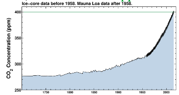 Enfin, la concentration moyenne de 2015 devrait se situer entre 400 et 401 ppm, voire au-dessus de 401 ppm. Elle était de l’ordre de 280 ppm à l’époque préindustrielle. Elle a augmenté de manière exponentielle suite à l’utilisation des énergies fossiles (pétrole, charbon, gaz) pour l’industrialisation.