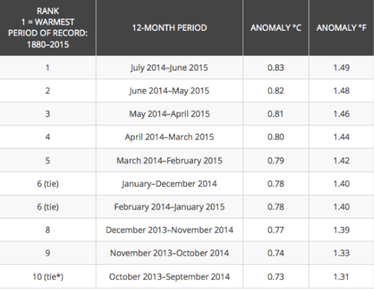 En ce qui concerne maintenant les douze derniers mois (juillet 2014-juin 2015), ils sont eux aussi les plus chauds jamais enregistrés, avec une anomalie de +0,83°C par rapport à la moyenne du XXème siècle selon NOAA. En fait, ce record est actuellement battu quasiment tous les mois. Le précédent record avait été établi il y a un mois, celui d’avant il y a deux mois, celui d’encore avant il y a trois mois et on peut remonter comme cela jusqu’à septembre 2014 (pour la période octobre 2013 - septembre 2014). Seule exception: le mois de janvier qui n’a été “qu’à égalité” avec le record du mois de décembre qui le précédait...