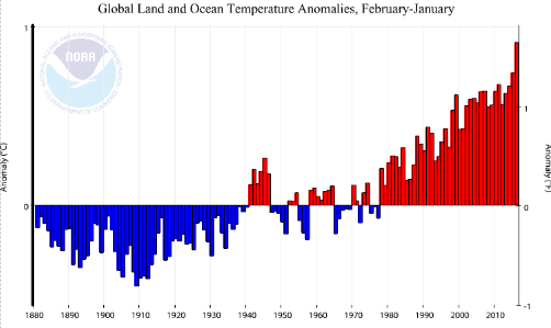 Avec l’aide d’El Nino, les douze derniers mois ont été plus chauds en moyenne de 1,04°C que la même période février-janvier en 1880-1881. C’est ce qu’il ressort des dernières statistiques de l’agence américaine NOAA (National Oceanic and Atmosphéric Administration) soulignant le nouveau record de température moyenne du premier mois de 2016: + 1,04°C par rapport à la moyenne de température des mois de janvier au XXème siècle. Cela confirme également pour bonne partie la précédente annonce du Goddard Institute for Space Studies de la NASA, estimant que ce mois de janvier 2016 a été plus chaud de 1,13°C par rapport à la moyenne 1951-1980.