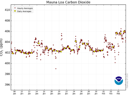Ces 405,98 ppm constituent un nouveau mais provisoire record, le record annuel étant généralement et logiquement établi au printemps vers avril-mai, juste avant la montée en puissance de la végétation sur les continents de l’hémisphère nord, qui font office de pompe à carbone. Le record 2015 s’est ainsi élevé le 13 avril à 404,84 ppm, soit 1 ppm de moins qu’au moins de février suivant... A ce rythme, les 410 ppm pourraient être en vue au printemps. Mauna Loa avait atteint les 400 ppm pour la première fois en mai 2013.