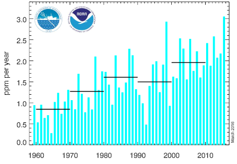 A ce rythme, la barre des 308 ppm devrait être franchie d’ici mai. En effet, les records annuels de concentration ont lieu pendant le printemps de l’hémisphère nord, avant la pleine saison de végétation, et on a atteint 404,81 ppm en 2015. En 2016, ce record a été battu dès février et on en était à 406,07 ppm le 24 mars.