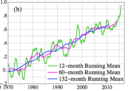 Boostée par l’actuel phénomène El Nino, réchauffant nettement l’atmosphère, cette accélération de l’augmentation de la température globale moyenne de la planète devrait maintenant être appelée à se consolider avec l’affaiblissement d’El Nino, explique également ce scientifique qui a alerté le monde politique sur les dangers du changement climatique dès les années 1980. Néanmoins, la tendance de long terme au réchauffement va bien sûr logiquement se poursuivre, toujours selon lui. Ce que montrent du reste les courbes d’augmentation que James Hansen effectue, que ce soit en prenant les températures moyennes des douze derniers mois, des 60 derniers mois ou encore des 132 derniers mois courants.