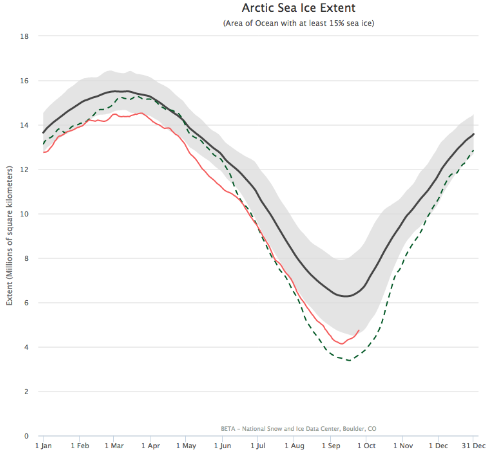 En nette diminution depuis des décennies, particulièrement ces dix dernières années, le minimum estival de la banquise arctique a atteint le 10 septembre, avec 4 137 000 km2 d'après les données satellitaires, son point le plus bas depuis 2012, année qui avait marqué un record absolu - 3 387 000 km2 le 17 septembre. Selon l'Agence américaine National Snow and Ice Data Center (NSIDC), 2016 marque ainsi, depuis que l'on effectue ce type de relevés, la seconde plus basse étendue de glace avec 2007, année durant laquelle un minimum de 4 154 000 km2 avait été enregistré le 18 septembre.