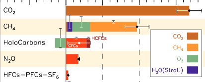 Sinon, à l'horizon 2100, le GIEC envisage dans son scénario "business as usual"` un forçage radiatif net de 8,3 W/m2 avec une contribution de 80% pour le CO2 et de 95% pour le CO2 et le méthane rassemblés, la pollution et l'usage des terres ayant pour leur part des effets plutôt "refroidissants" (-10% environ). On trouverait ensuite le protoxyde d'azote (N2O), l'ozone (O3) puis, avec quelques pourcents, les autres gaz à effet de serre dont les HFCs.