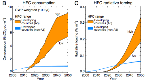 Ainsi, si l'effet des HFCs sur le réchauffement global reste à ce jour négligeable, le Protocole de Montréal fait en sorte, avec cet amendement de Kigali, que la lutte contre le trou de la couche d'ozone n'aggrave pas à l'horizon 2050, à cause des hydrofluorocarbures, la question des gaz à effet de serre. "Business as usual", une étude publiée par Proceedings of the National Academy of Sciences of the United States of America (PNAS) estime en effet que le forçage radiatif dû aux HFCs serait de l'ordre de 0,2 à 0,3 W/m2 à la moitié du XXIe siècle, principalement du fait de l'explosion de leur utilisation dans les pays en développement.