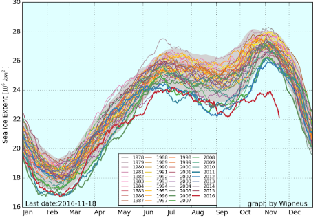 C’est sans doute pour le réchauffement planétaire et l’avenir de la civilisation humaine une nouvelle bien pire que l’élection du milliardaire climatosceptique Donald Trump à la tête des Etats-Unis: les superficies des banquises arctique et antarctique sont toutes les deux à des niveaux si bas pour la saison que le total des glaces de mer (Arctique et Antarctique confondus) dévisse nettement par rapport à la courbe normale de leur évolution saisonnière ! Les jours suivants le 16 novembre, la banquise arctique est même entrée dans une étonnante phase de réduction alors qu’elle est normalement en phase active d’extension avec l’arrivée de la nuit polaire. Au 20 novembre, sa superficie était estimée à 8,625 millions de km2 contre 8,674 quatre jours plus tôt, selon les données de l’agence américaine NSIDC (National Snow and Ice Data Center).