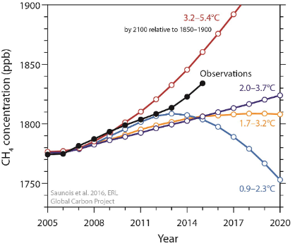Ayant fait appel à plus de 70 scientifiques -du fait de la variété des sources de méthane- et servant à la mise à jour des données du Global Carbon Project, cette étude montre qu'aucun des scénarios du GIEC, Groupe d'experts intergouvernemental sur l'évolution du climat, ne reproduit l'évolution récente observée des concentrations de méthane: les trois scénarios les plus optimistes sont maintenant clairement en dessous de la réalité tandis que la tendance actuelle d'évolution rapproche cette réalité du scénario "business as usual", le scénario noir du GIEC, mais avec des concentrations inférieures aux prévisions. "Les scénarios d’émissions étudiés par les climatologues dans les simulations numériques du climat futur, notamment dans l’objectif de rester sous la barre des 2 degrés de réchauffement climatique global, doivent prendre en compte les émissions de méthane", commente Philippe Bousquet.
