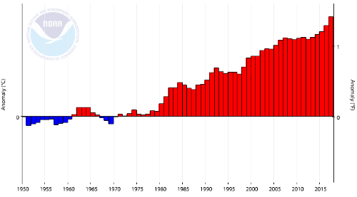 La température planétaire moyenne des 60 derniers mois, c'est-à-dire des cinq dernières années, affiche en ce début 2017, une anomalie de +0,79°C par rapport à la moyenne du XXe siècle, selon les chiffres de l'agence américaine NOAA, c'est-à-dire plus ou moins +1°C par rapport aux niveaux préindustriels. Atténuant l'effet grossissant d'années "chaudes" et d'années "froides", ainsi que les distorsions dues aux phénomènes El Nino et La Nina, cette moyenne de température sur les cinq années précédentes est en forte hausse. Elle a gagné environ un dixième de degré en trois ans.