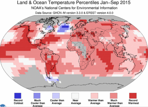 Le mois de septembre est, selon l’agence américaine National Oceanic and Atmospheric Agency (NOAA), le 5ème mois consécutif de 2015 à battre le record de température moyenne de sa catégorie: il dépasse la moyenne des mois de septembre du XXème siècle de 0,9°C, ce qui constitue le plus fort écart à la moyenne jamais enregistré depuis que l’on fait ce genre de relevé, c’est-à-dire depuis 1880. Datant de l’année passée, le précédent record est battu de 0,12°C. Il se confirme ainsi un peu plus que l’année 2015 va battre tous les records et sera plus chaude d’environ 1°C par rapport au début du XXème siècle.